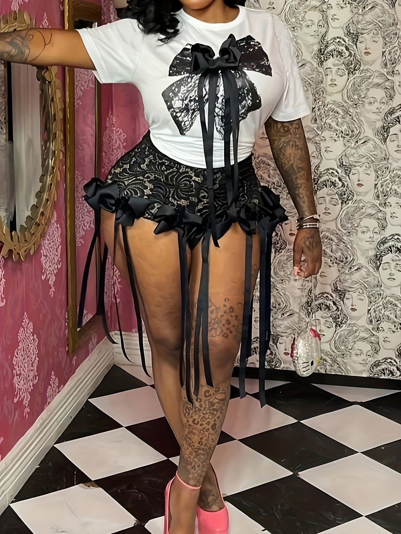 Dollhouse Drip is a bold statement 2 piece outfit designed to turn heads and own the room. Featuring a fitted white top with an oversized lace bow detail and high-waisted black lace shorts accented with dramatic ribbon ties, this look blends coquette charm with confident, grown-woman energy.