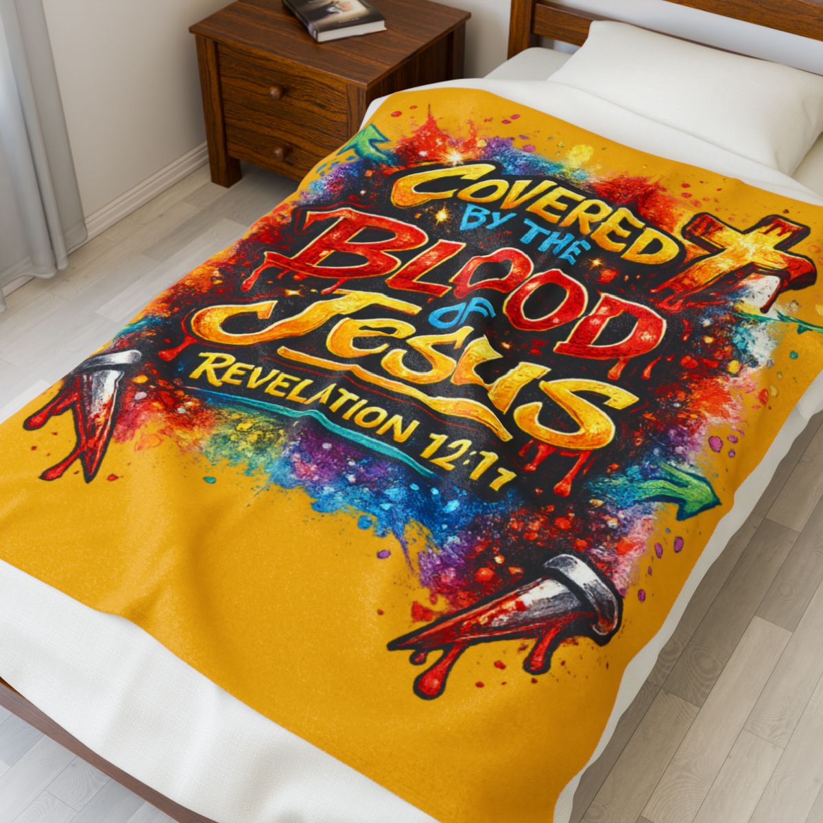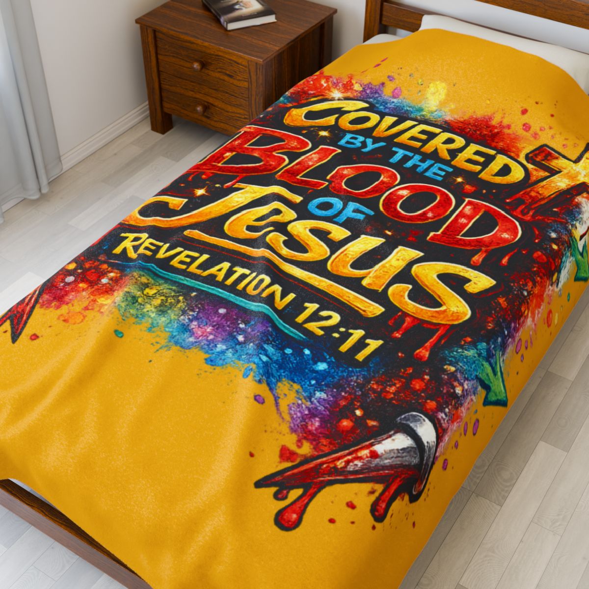 The Covered by the Blood of Jesus – Revelation 12:11 Blanket is more than a cozy throw—it’s a declaration of protection, peace, and unwavering faith. Designed with vibrant, graffiti-style artwork and powerful scripture, this blanket serves as a reminder that you are covered, redeemed, and never alone.