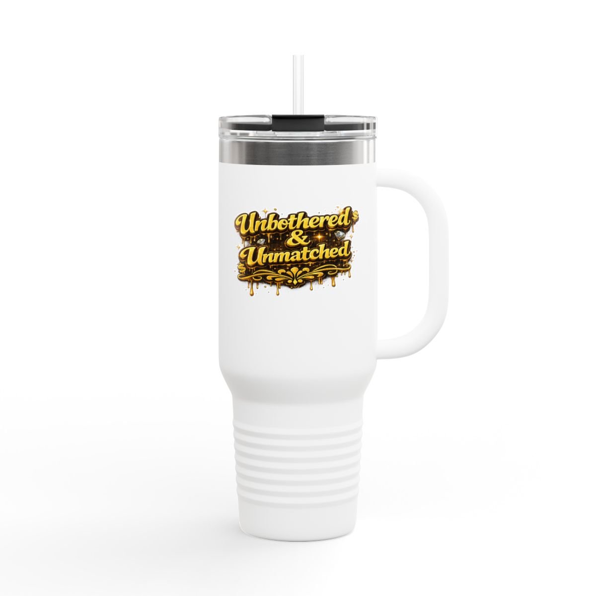 This tumbler is for those who keep their energy high and their circle small. Featuring bold 3D gold Unbothered & Unmatched lettering with an urban luxury finish, this piece is a daily reminder to stay locked in and unphased.